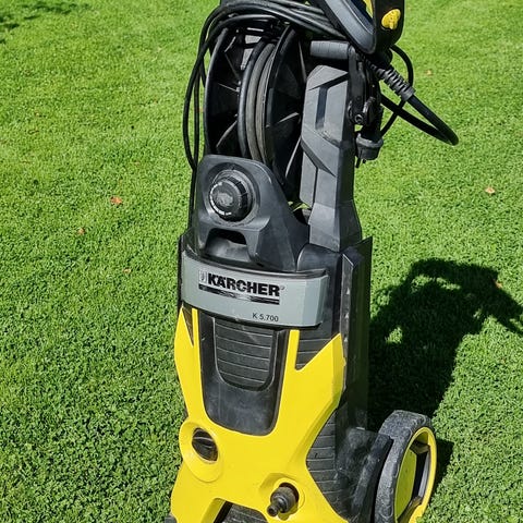 Kärcher K4 Premium høytrykkspyler i gul farge. Utstyrt med slangeoppheng og ulike tilbehør for rengjøringsformål.