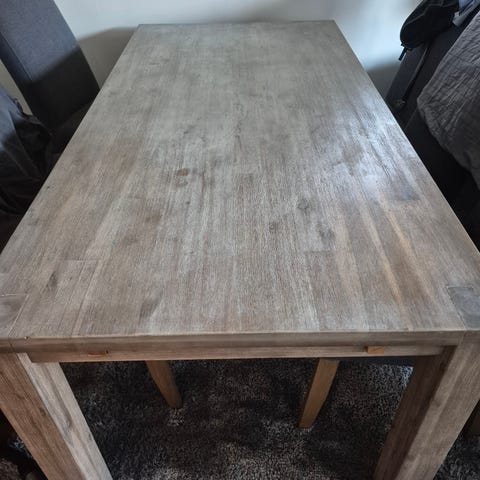 Selges pga behov for noe mindre. Noen merker og små hakk langs den ene kanten (se bilder), men fint brukt. Ingen hakk i overflaten på toppen. Passer 3 brede eller 4 smale stoler langs sidene. Komfortabel plass til 8 (6+2)stk, eller 10 (8+2) i f.eks. barnebursdager.