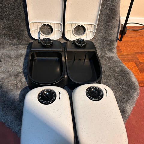 Sett bestående av en katteseng og en katteleke. Kattesengen er grå med fleecefôr på innsiden, og katteleken er brun med fleecekant og en liten leke festet til snor. Materiale inkluderer myk tekstil med fleecefôr, posen knitrer noe som gjør den veldig spennende å krype inn i, ypperlig for katter som elsker å krype opp i poser elr pappposer. Selges samlet . Kom med bud