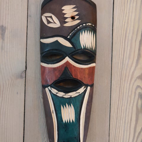 Masken har utskårne detaljer og dekor med lyse innfelte mønstre.