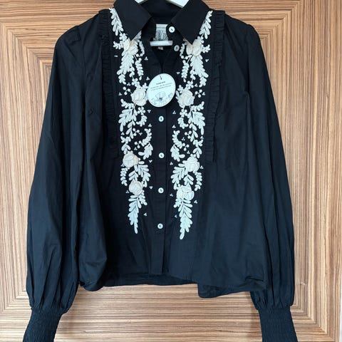 Lekker bluse med broderier fra Scarlett Poppies, modell Marie Antoniette. Rett fasong og vide armer. Festes i front med hemper. Str. XS, men er stor i størrelsen og passer fint en small. Brukt kun en gang. Kostet kr. 4.600,- ny.