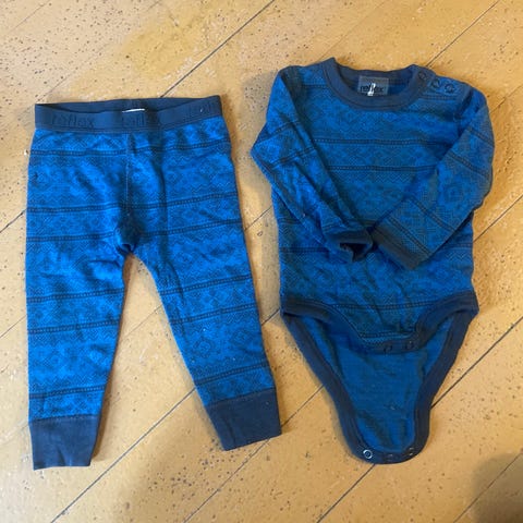 Sett består av body og bukse laget av ullmateriale, egnet for barn.