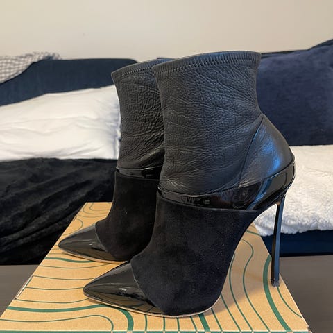 Black „sock” boots with a gold stiletto heel. Heel height 11cm.