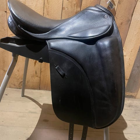 Salen er en Claridge House dressursal, lett og god, i syntetisk materiale. 17,5 x 32/34ca. Vanskelig å lese lappen.