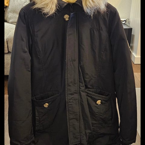 Svea Miss Smith er en dunjakke / Parkas fra SVEA. En oppfølger til den populære jakken Smith, denne modellen er smalere og har en innsvinget passform. En perfekt ytterjakke. To lommer og glidelås i vindstolpe foran. Ribbekant nederst på ermene og hette med avtagbar fuskepels. Snøring i midjen. Varmeskala 5 av 5.