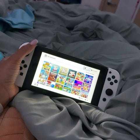 Nintendo Switch konsoll med håndholdt spillmodus. Konsollen har innebygde kontroller og skjerm, egnet for både bærbar og stasjonær bruk.