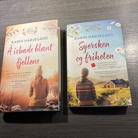 Karin Harjegrad romaner bestående av titlene Å bade blant fjellene og Syersken og friheten. Bøkene er skjønnlitterære verk som utforsker temaer knyttet til kjærlighet, liv og frihet i fjellandskap. Inneholder tekst på norsk. 100 kr for begge.
