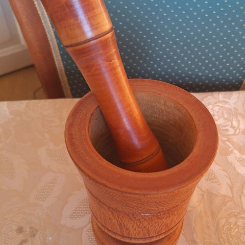 Selger en morter i tre med tilhørende støter, solid og dekorativ.