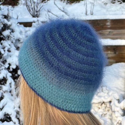 Jeg har vasket og prøvd skjerfet på. Skjerfet rekker 2 ganger rundt hodet. Garnet som er brukt er Minialpakka fra Sandnesgarn.