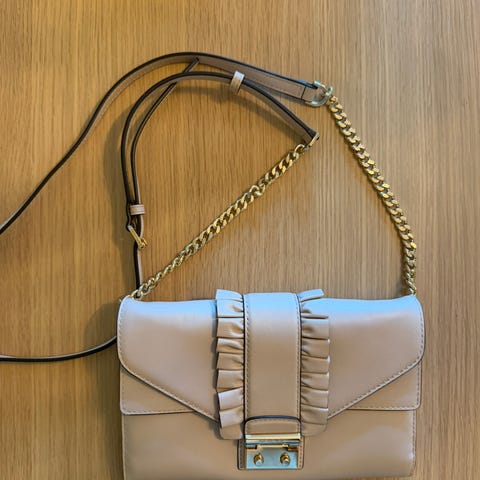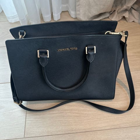 Michael Kors skulderveske for dame laget i sort lær. Vesken har en quiltet design med en gullfarget kjede som skulderrem og en gullfarget lås på fronten.