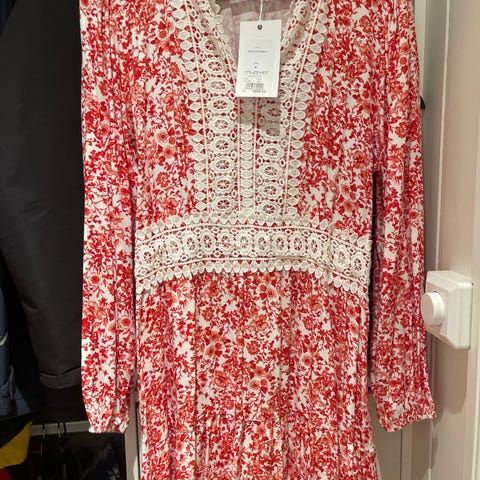 Ny Floyd sommerkjole i størrelse XS svart med blå blomsterprint. Laget av polyester. Kjolen har en lang modell med ermeløs design, egnet for kvinner.