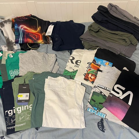 På siste bilde er det 2 gensere og 4 bukser som kan følge med- disse har noen flekker og hull på knær. Følger med om ønskelig.
