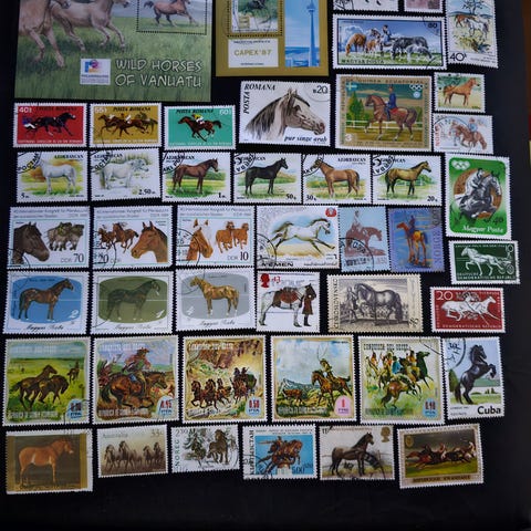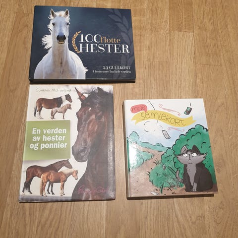 Sett med 36 nydelige hestekort fra Penny klubben som inneholder fotografier av hester og informativ tekst om hester, inkludert fakta om ulike hesteraser, ridning, kjøring og stell. Kortene viser forskjellige hester i ulike farger og posisjoner, samt tekster som forklarer emner som pels, hovstell, trav, kjøring og rytterutstyr.