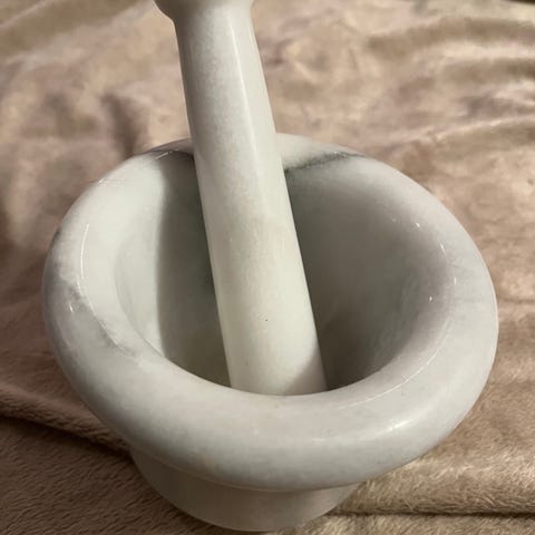 Morter i lys grå marmor. Aldri brukt. Kjøpt i København for et par år siden. Høyde ca 6 cm, diameter ca 11,5 cm. Hentes eller sendes på kjøpers risiko.