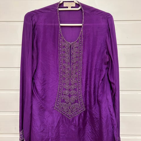 Håndbrodert med perler, fra Italia. Jeg har ikke klart å finne noen feil eller mangler på den. Nydelige broderier på hals/bryst og på ermene. Knapper langs ryggen.