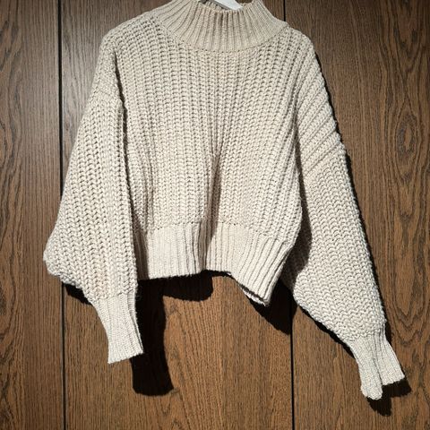 Lang beige strikket genser selges. Kan sendes.