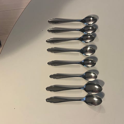 To spiseskjeer, fire kakegafler og fire kaffeskjeer (12.5 cm).