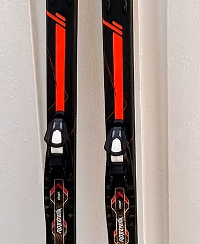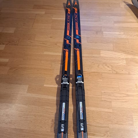 Gummiklossene på bindingen er borte, men skiene er brukt uten disse - og det bør være en smal sak å kjøpe nye hvis det er ønskelig