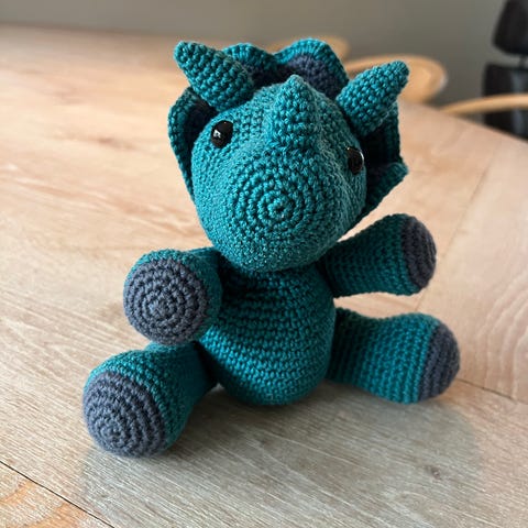 Denne søte dinosauren er heklet med kjærlighet ❤️ i mykt og behagelig garn. Fargerike detaljer på ryggen gir den et lekent og unikt uttrykk. Perfekt som kosebamse, gave eller dekorasjon på barnerommet.