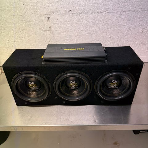 Hifonics Mercury basskasse med to høyttalere og tilhørende Ground Zero forsterker. Basskassen er kledd i svart stoff og har tilkoblinger bak. Forsterkeren er i metall med kjøleribber og har tilkoblingspunkter for strøm og høyttalerkabler.
