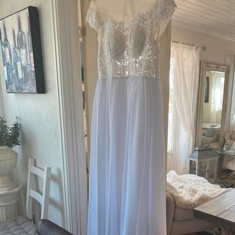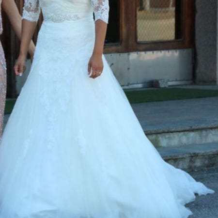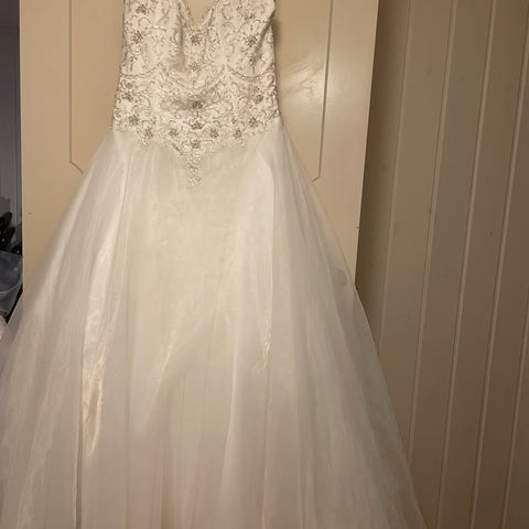Pen brudekjole selges. Denne brudekjolen er egentlig i god stand men har noen flekker rundt om kring så må renses, men ellers er denne brudekjolen veldig fin. Denne kjolen er str M-L