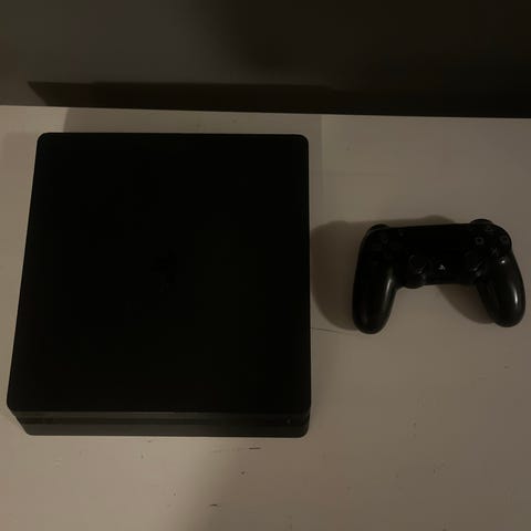 Sony Playstation 4 slim spillkonsoll i svart farge. Konsollen har et kompakt design med flere tilkoblingsporter bak. Inkluderer en svart kontroller. Passer til bruk med Playstation 4 spill digitalt og fysisk. 1 TB lagring.