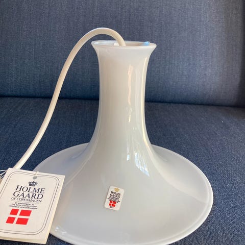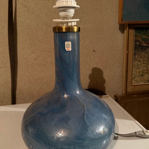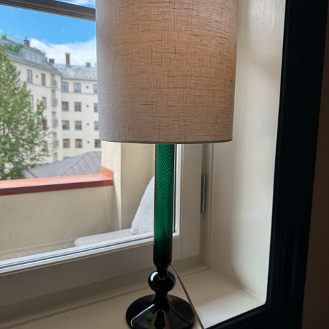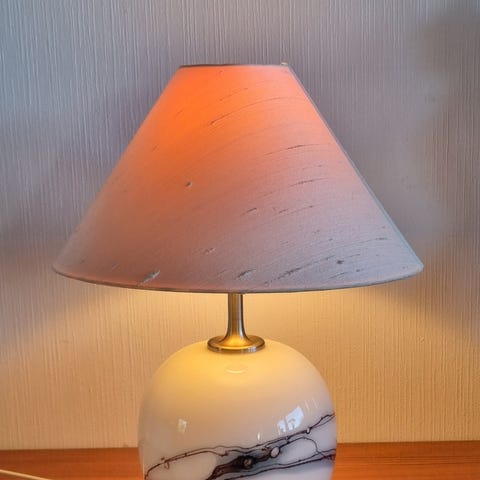 Nydelig stor glasslampe fra Holmegaard Royal Copenhagen modell Torino med håndlaget skjerm i stoff fra G.P. & J. Baker England