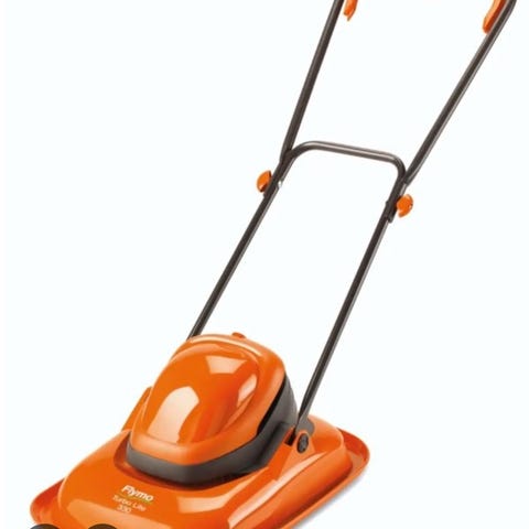 Flymo Turbo Lite 350 gressklipper i oransje farge. Elektrisk modell egnet for mindre plener. Kompakt design med håndtak for enkel manøvrering.