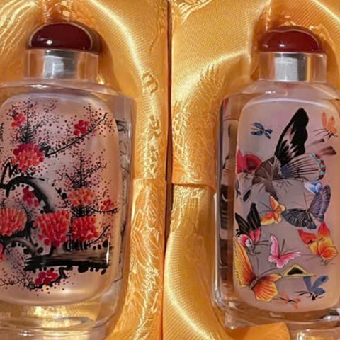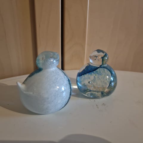 To ravgule fugler fra Eneryda Glasbruk i Sverige.