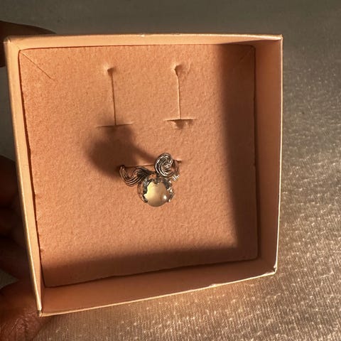 Ria Ring stråler i rampelyset med sit elegante bånd af små gyldne former og glimtende zirkoner.