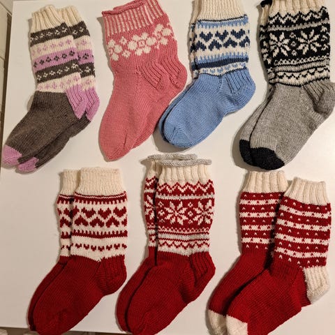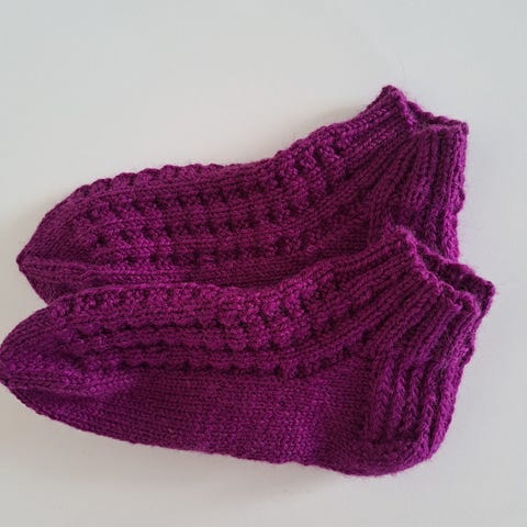 Kr 250 pr par. Kr 180 for ankelsokker. Pluss porto Posten. Passer str 38-40. Strikket I Viking Sportsragg.