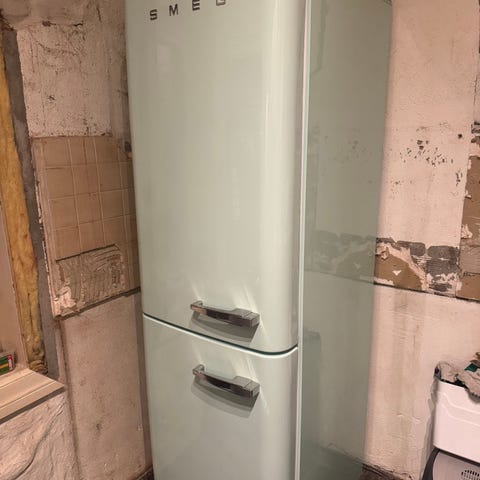 Nødvendig med tralle eller lignende for å få kjøleskapet ut av leilighet og ned trappen.