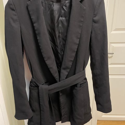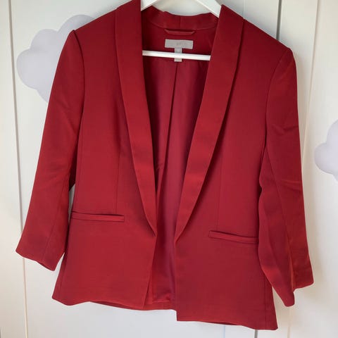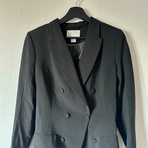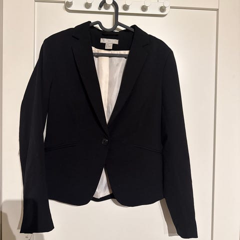 H&M blazer i flerfarget mønster laget av polyester. Blazeren er designet for damer og har størrelse 36. Materialet består hovedsakelig av polyester med elastan for fleksibilitet.