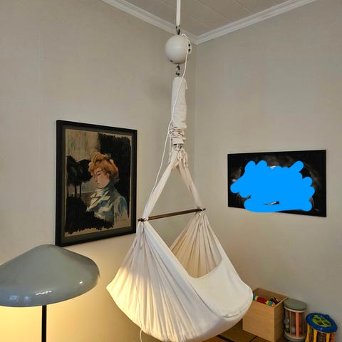 Lite og pent brukt moonboon hengevugge med stativ og motor selges. Ingen flekker eller bruksmerker.
