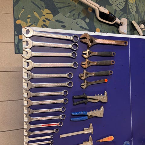 Er mye bra verktøy som følger med, 2x Wurth driller med lader usikker på alder, men er en del år gamle. Wurth skrallefast sett, masse fastnøkler , blanding av tengtools og Nordic skalle 1/2 tom og underdel med skuffer. Og mye kroker og oppheng.