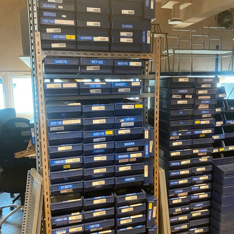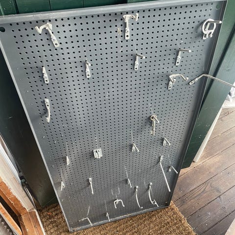 Metall oppbevaringspanel med blå plastbokser