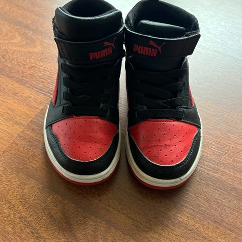 Puma barnesko for gutt i størrelse 28. Skoene har en høy modell med borrelås og lisser, og er laget i grønt materiale med brune såler. Egnet for barn og gir god støtte til foten.