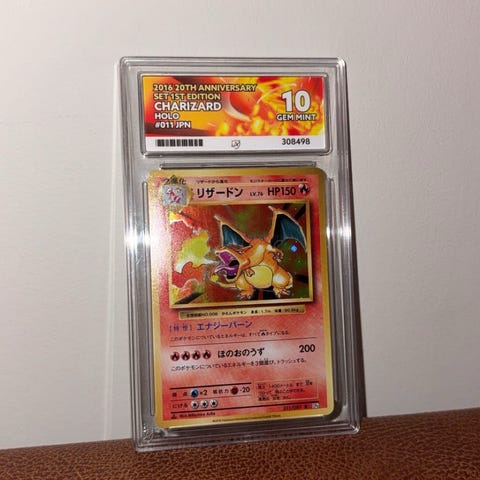 Pokémon Charizard samlekort med illustrasjon av Charizard på forsiden. Kortet er beskyttet i plastlomme for å bevare tilstanden.