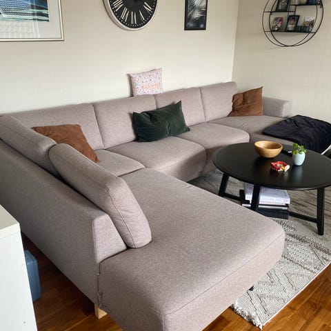 Kjøpt juli 2024 - så fortsatt i ganske god stand! Vurders solgt bare fordi jeg syns den blir litt for stor i min stue. Ellers elsker jeg sofaen! Både at den er så romslig, samt godt å sitte/chille i og at det er velour stoff som er super enkelt å holde rent 🤩