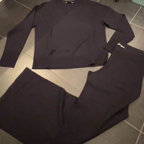Vid bukse med bred strikk i livet, jakke med belte i livet.
