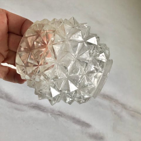 Sokkel i porselen. 3 kuppler i glass og en i plast.