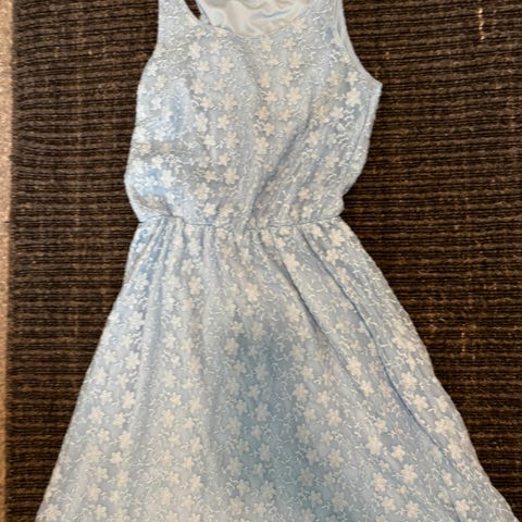Str 146/158 - Nydelig sommerkjole med strikkribbet overdel og splitt nederst, selges for kr 60,-.