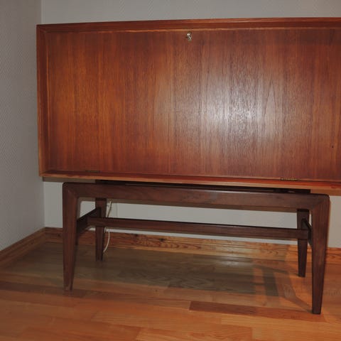 Retro aviskurv i teak og messing selges. Den er reparert ved at det er skrudd inn nye skruer nederst langs kanten, se bilder.