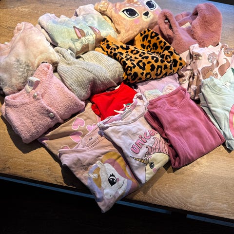 Fin klespakke i 122. Normal slitasje til ubrukte klær, det kan forekomme flekker. Jeg så ingen når jeg gikk raskt over.