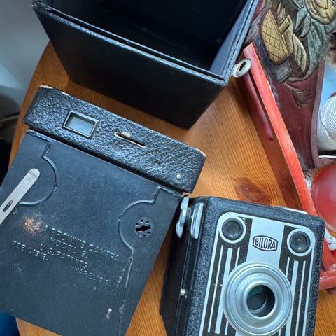 Gammelt kamera med skinnveske, ikke noe knust eller ødelagt.