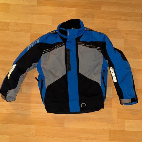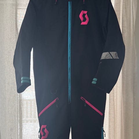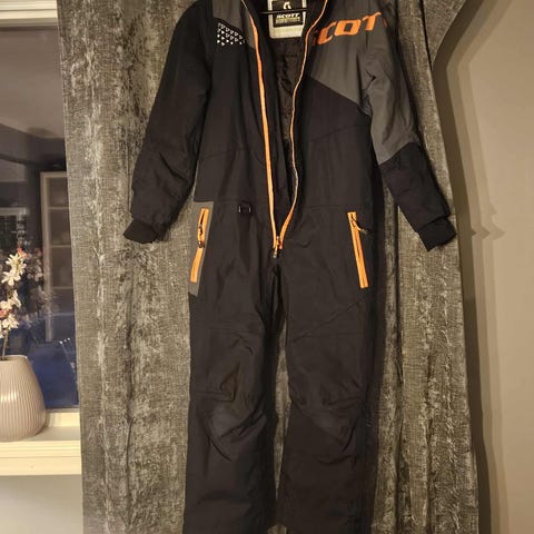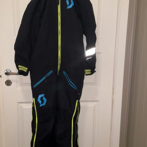 Kjempefin foret snøscooter dress fra Scott. Går helt fint og bruke som skidress også. Hetta går å ta av hvis man ønsker. Ser ikke noe hull eller flekker, men dressen er brukt og det er f.eks. litt "rufsete" nede i beina (se siste bilde) størrelsen er 140.