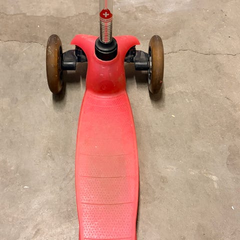 Vi skal over fra tre til to hjul, og fem-åringen ønsker å selge denne for å kjøpe en ny. Den er slitt, men funker fint og er pimpa opp med hjulkapsler som blinker når den suser rundt.