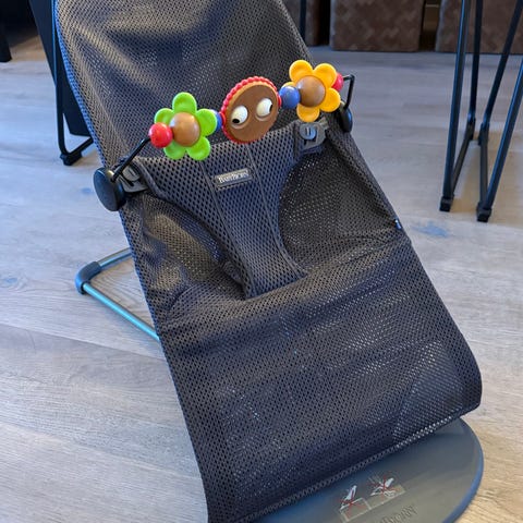 Babybjörn vippestol i sort og grått stoff. Barnestolen har en enkel og funksjonell design med en lekeaktivitet festet foran. Stoffet viser litt slitasje og små skader, som vist på bildene, men mye bruk igjen. Fungerer som den skal og kun slitasje