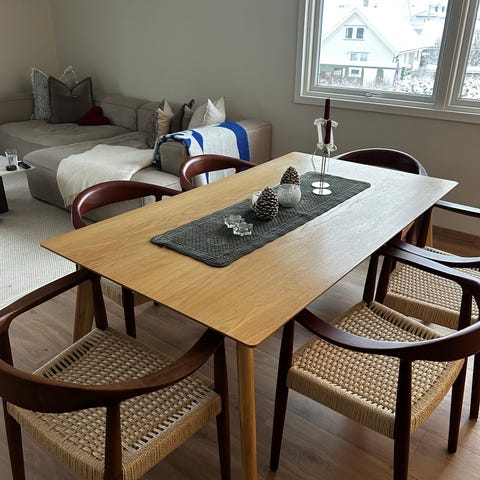 Medfølger 6 spisestoler i heltre eik fra IKEA, med vaskbart putetrekk. Trekk fås også i andre farger. Stolene bærer preg av bruk, men er hele og pene.