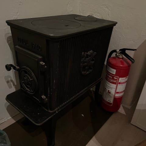 Vedovn i støpejern med svart finish. Egnet for oppvarming av rom. Dør med håndtak og luftregulering for kontroll av forbrenning.